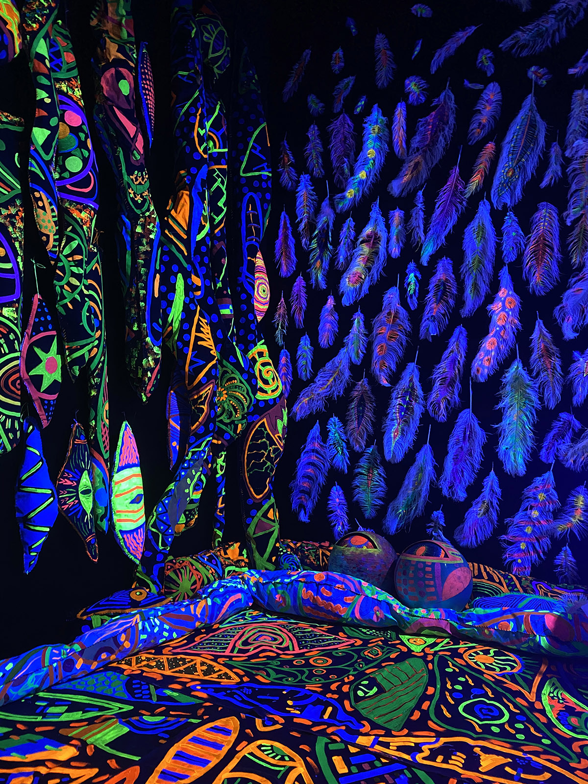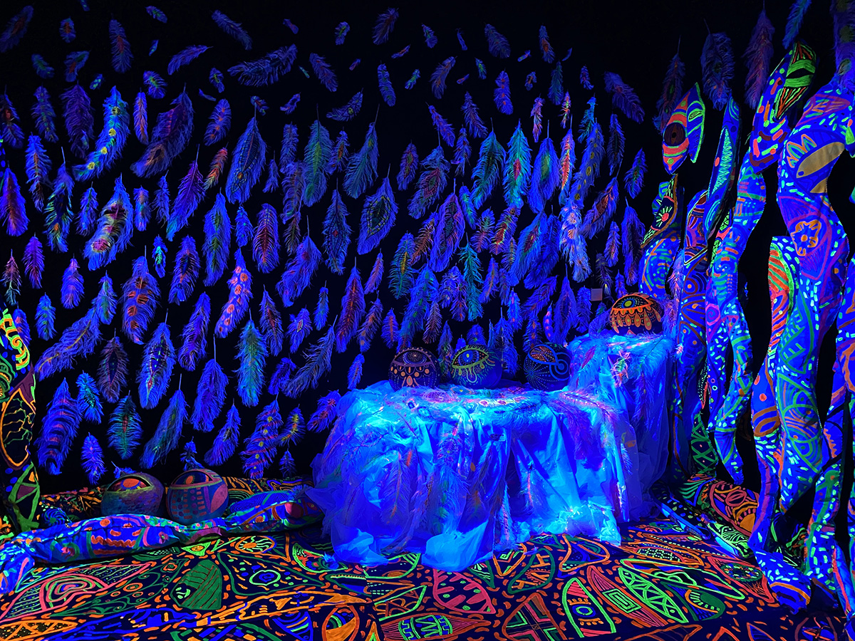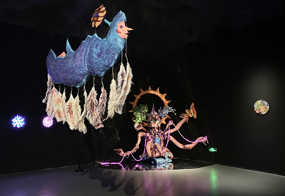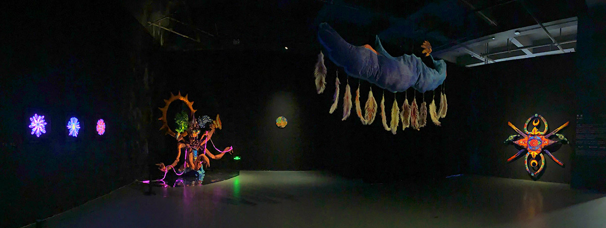 装置、绘画、布雕、VR……不拘泥于单一的表现形式,不局限于独立的艺术技法。冲破现实与虚拟的壁垒,削弱空间与维度的界限,在流动的时间长河中,呈现图腾的轮回。置身其中,“来如春梦几多时?去似朝云无觅处”,完成莫比乌斯的循环。飞鸟如画,似幻非幻。“夜半来,天明去。”眼到之处是为门,开启精神的遨游。横穿时空,鉴赏历史的每一个个切面,一个个瞬间。“留为鉴中铭,晨夕思千千”。