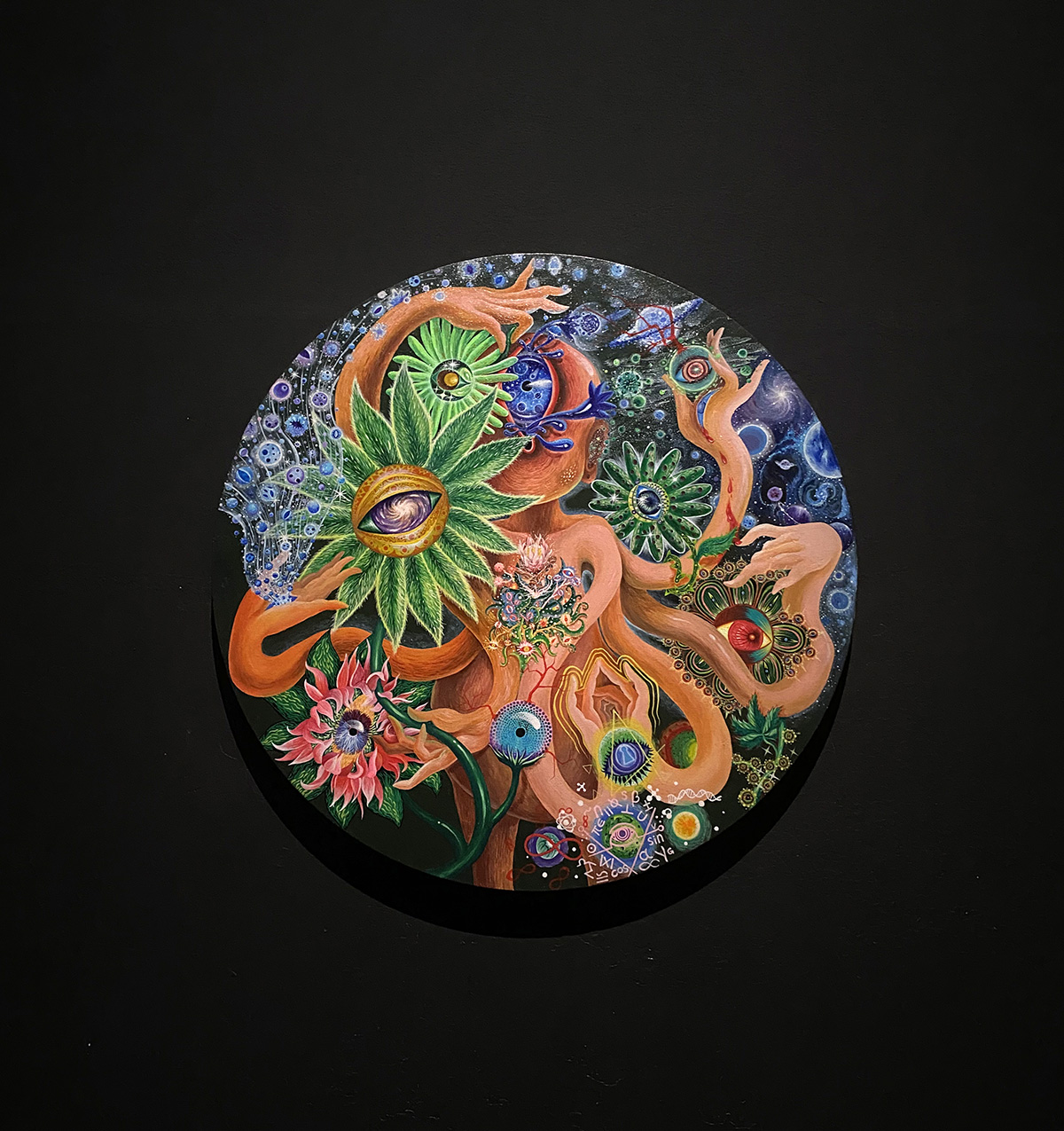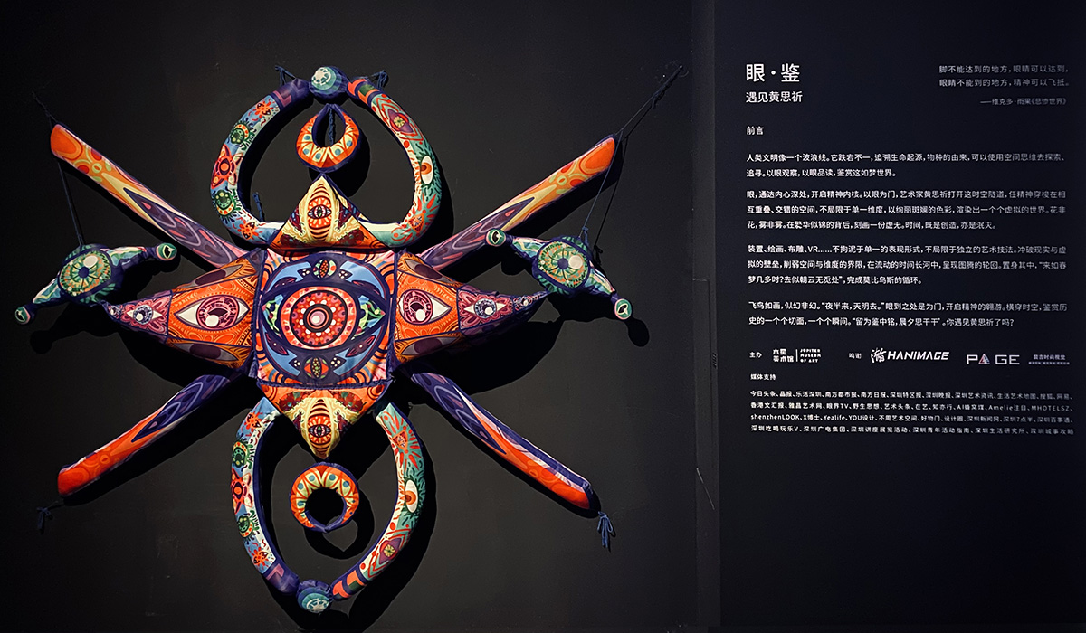人类文明像一个波浪线。它跌宕不一,追溯生命起源,物种的由来,可以使用空间思维去探索、追寻。以眼观察,以眼品读,鉴赏这如梦世界。眼,通达内心深处,开启精神内核。以眼位门,艺术家黄思祈打开这时空隧道,任精神穿梭在相互重叠、交错的空间,不局限于单一维度,以绚丽斑斓的色彩,渲染出一个个虚拟的世界。花非花,雾非雾。在繁花似锦的背后,刻画一份虚无。时间,既是创造,亦是泯灭。