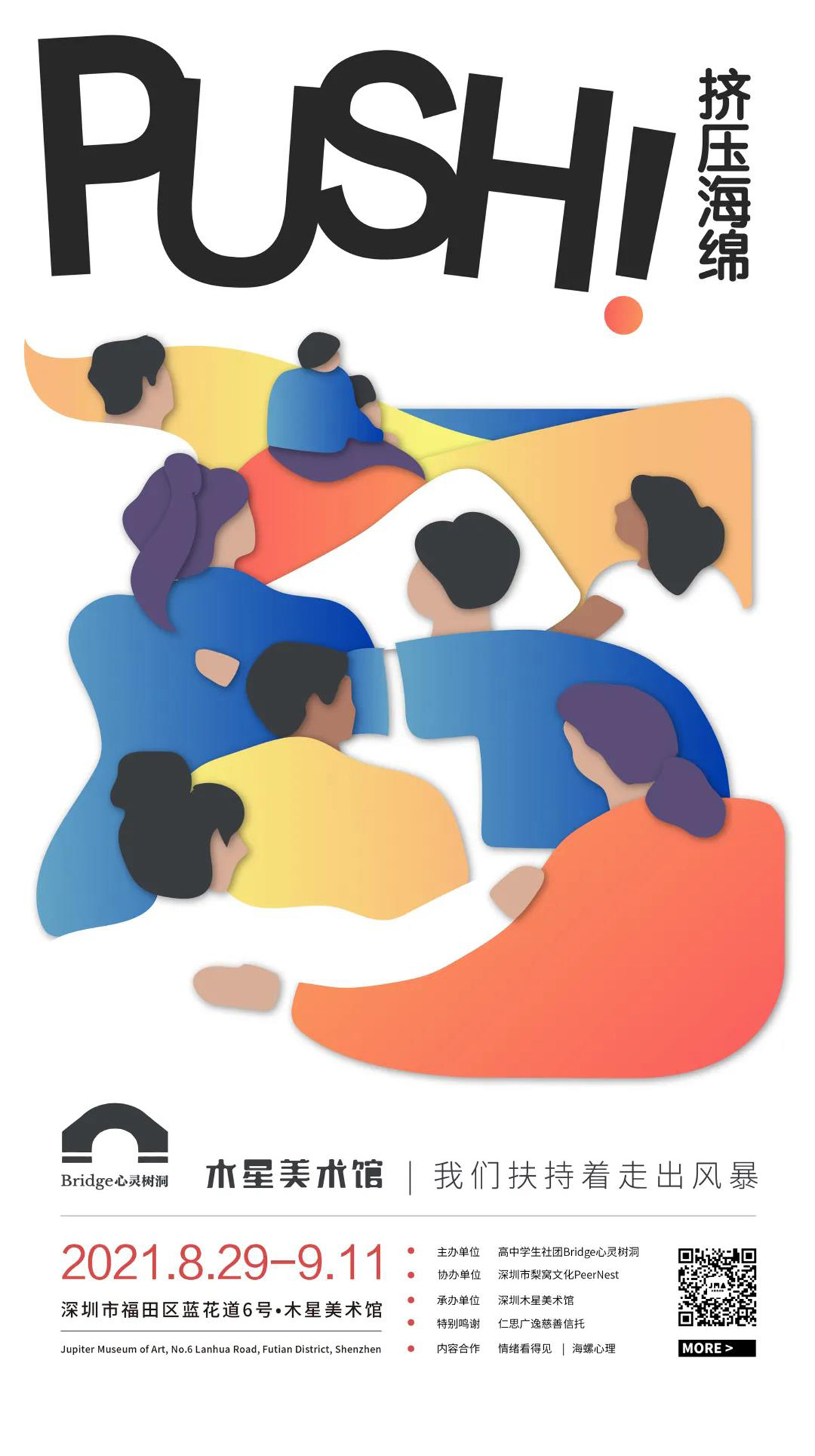 8月29日至9月11日,“Push!挤压海绵”青少年心理健康公益展览系列公教活动于木星美术馆顺利举行。我馆携手专业心理疗愈机构「情绪看得见」主创团队,发起了4场不同主题的疗愈性艺术体验,邀请学员在艺术创作中,通过视觉语言看见情绪、认知情绪、表达情绪、疗愈情绪,完成了自我探索和身心疗愈的奇妙旅程。