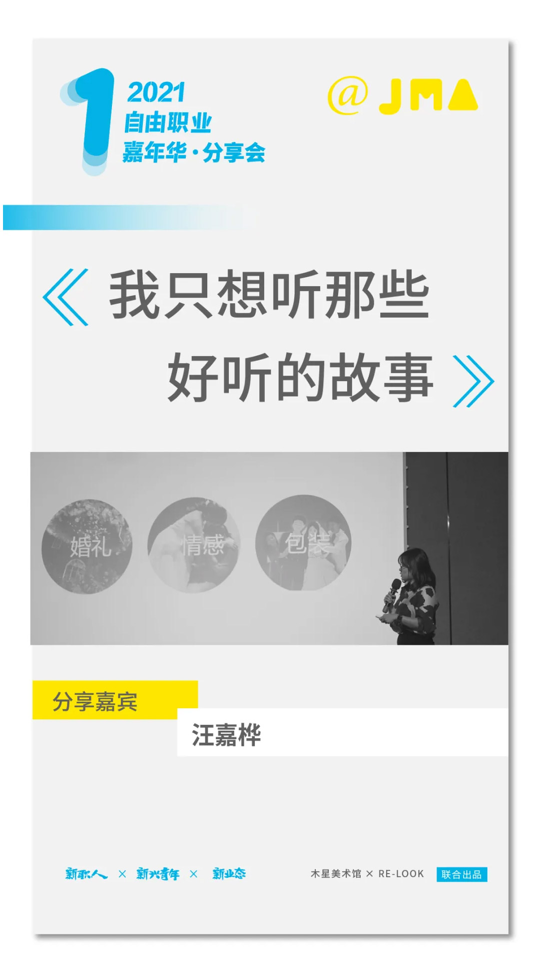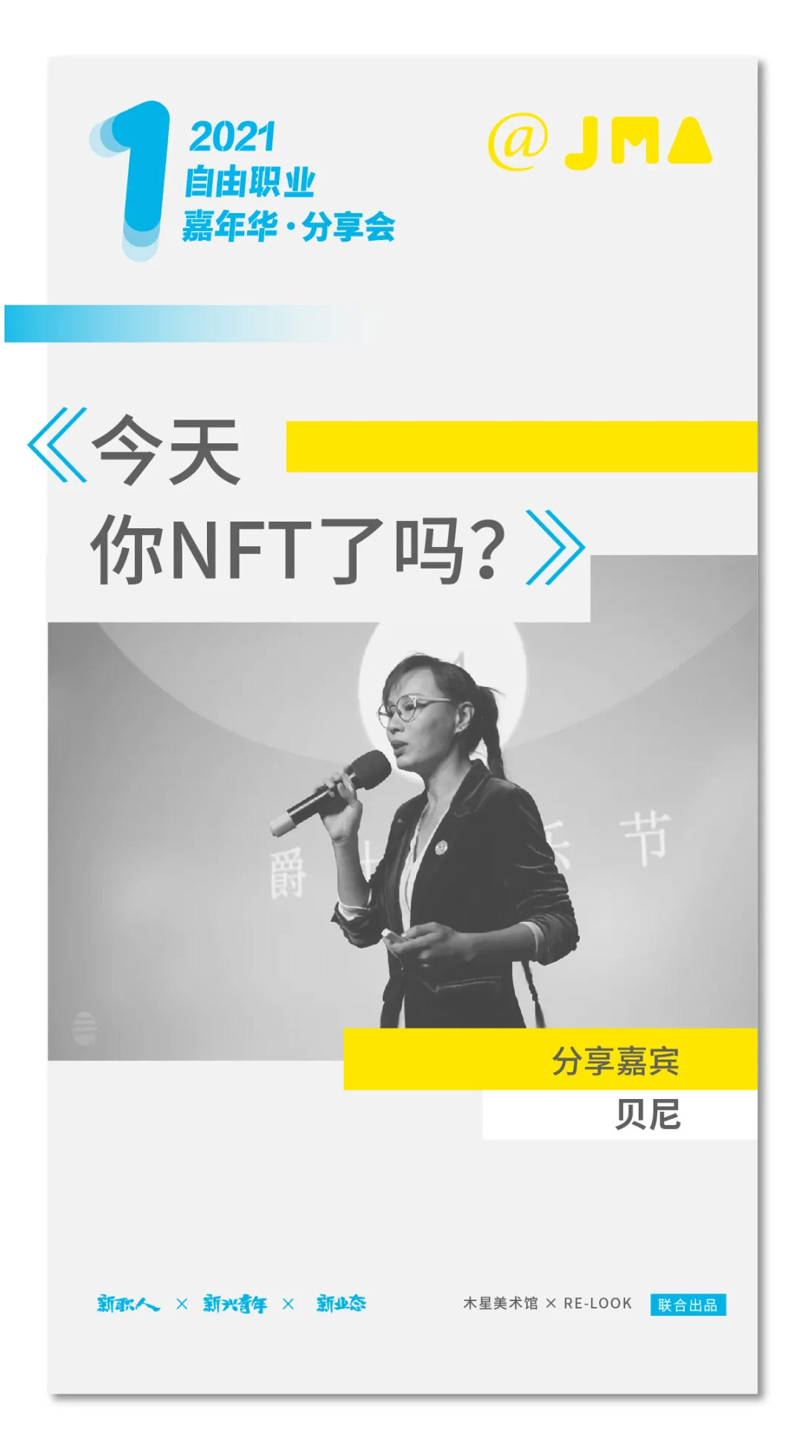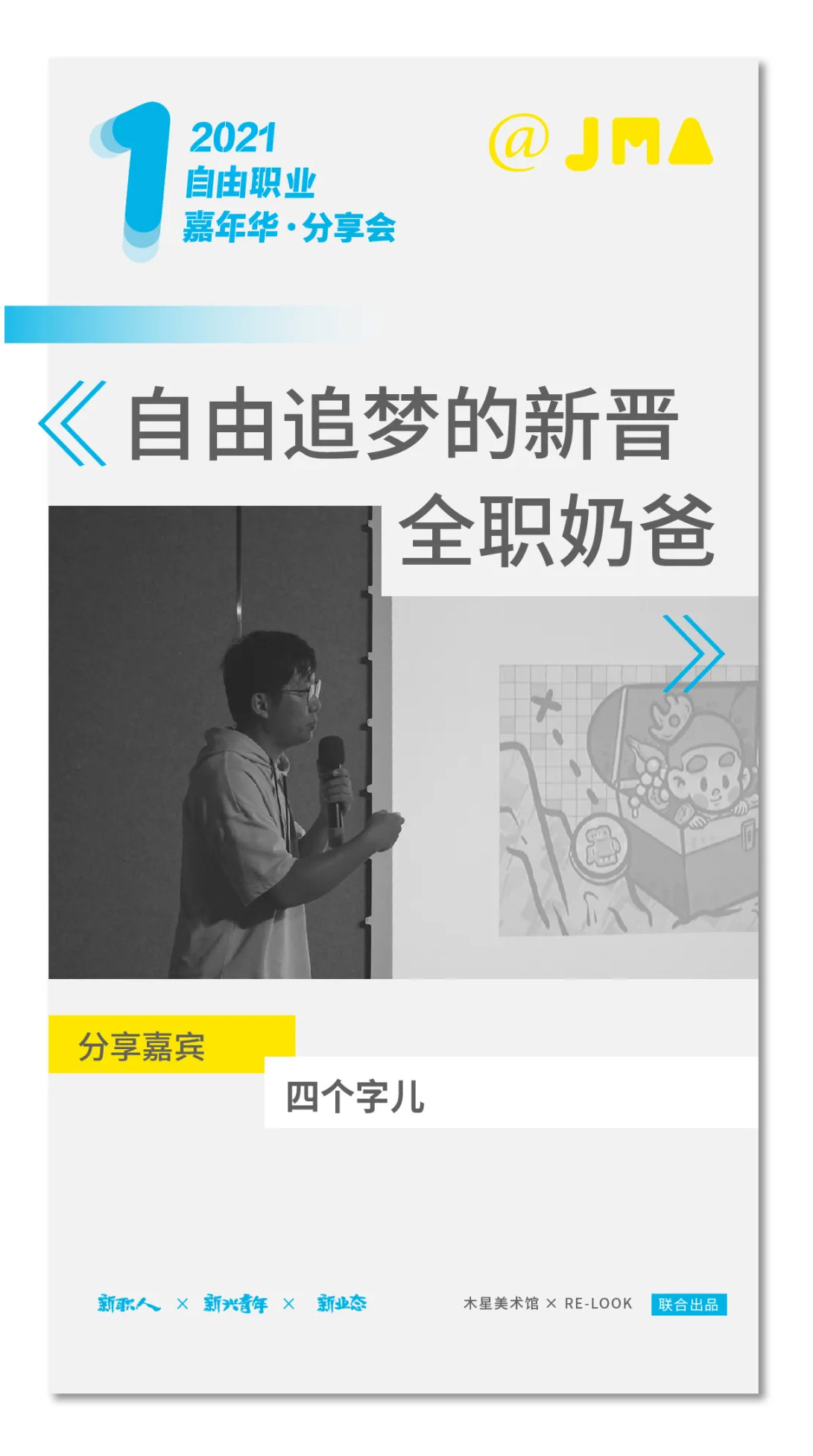 四个字儿分享了自身在全职奶爸和自由职业寻找平衡的当下体验,他认为,成为自由职业者,需要重新定位自身,寻找合适自己的⻛格。而每个人都是艺术家,每个人都可以有自己的一件得意的作品。借着最近很时兴的NFT,在现场他和大家聊了聊技术和艺术的虚拟世界的话题。他特别提到木星美术馆目前在展的《流动的生活形态展》,小朋友的作品,大师的风范,NFT可能就是为了所有人而出现的艺术形式吧。他认为自由职业有无限可能,有更多空间和时间,更多陪伴家人朋友,更多兴趣爱好的发散,更多的PLAY TIME;不需要有定式随性发挥自我,坚持自己想做的,其他的都交给时间,这就是自由职业。