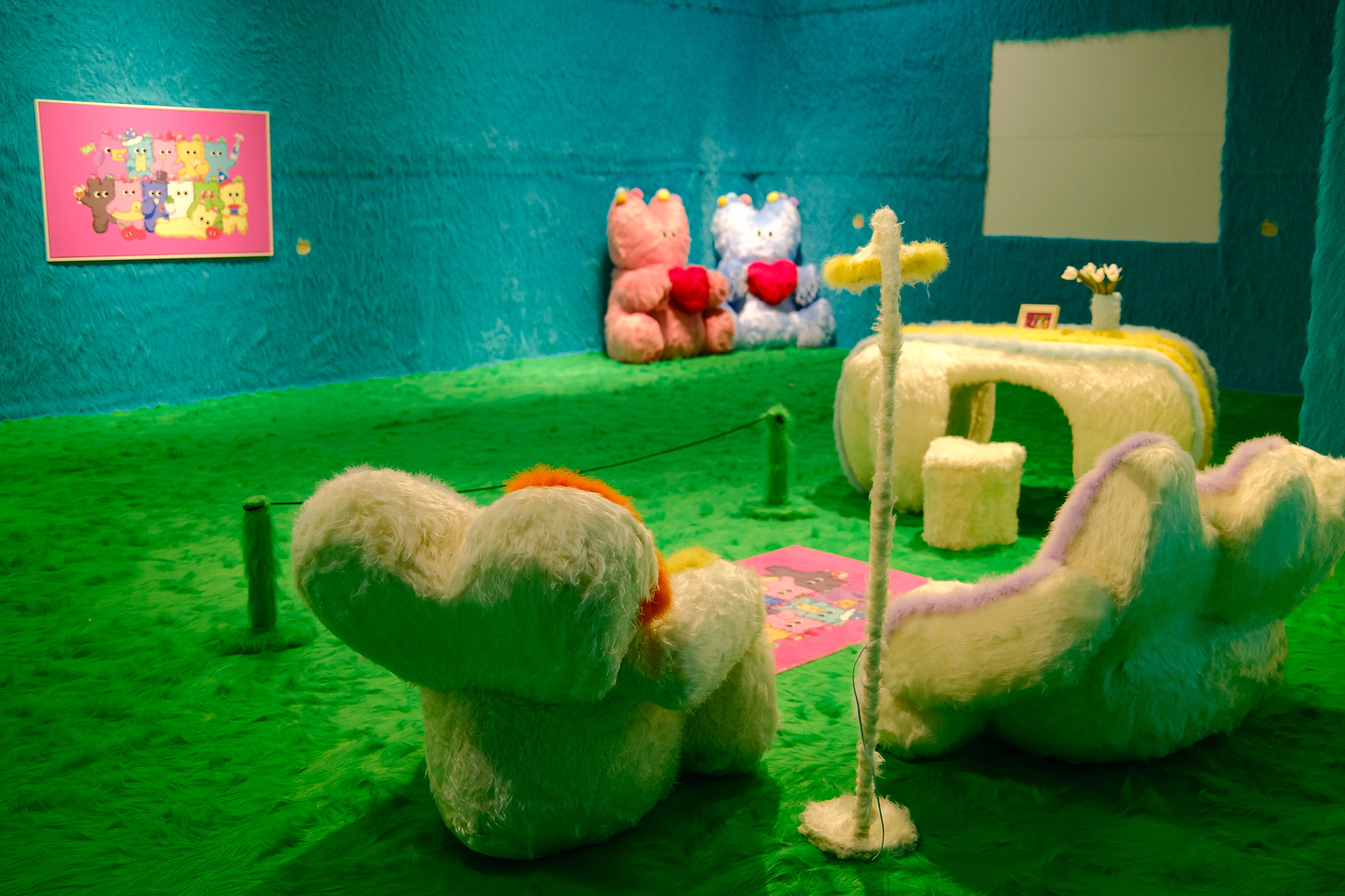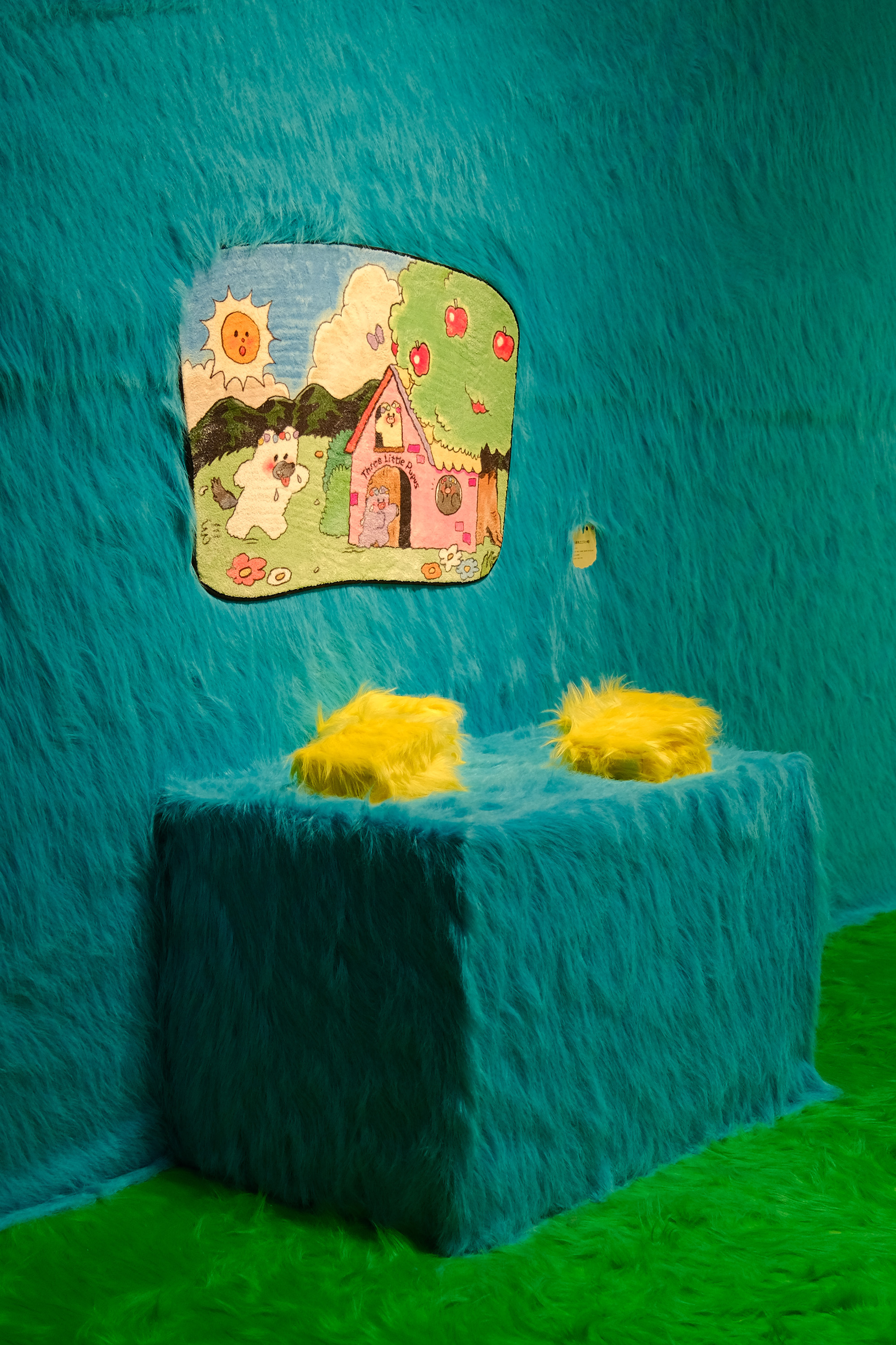 值得一提的是展览中,由我及我们工作室成员手工制作的奶噗噗系列家居,这是我对于奶噗噗入侵“家”的畅想,当这个全身毛绒绒的大家伙来访,一切都会被传染上一种名叫“温暖柔软”的病毒。于是桌子也长毛了,书架也长毛了,一切都变的温暖起来。当然以上还不是展览的全貌,我们还利用耳熟能详的三只小猪的故事,设置了一个“三只小噗”的互动板块,希望可以给大家带来乐趣。