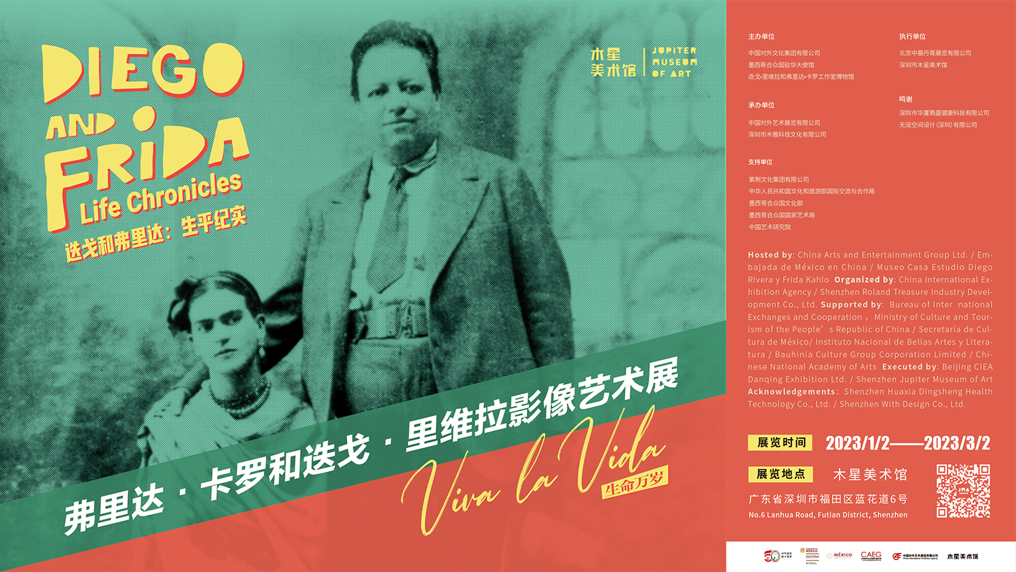 In order to promote cultural exchange and cooperation between China and Mexico, the exhibition Viva la Vida —— Diego and Frida: Life Chronicles, organised by China Arts and Entertainment Group Ltd., Embajada de Mexico en China and Museo Casa Estudio Diego Rivera y Frida Kahlo. The exhibition will be shown at the Jupiter Museum of Art from 2 January 2023 to 2 February 2023. It will present the artistic careers and achievements of Mexican artist Frida Kahlo and Mexican muralist Diego Rivera, including 60 documentary photos and related videos.